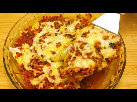 - Em um pirex, faça camadas alternadas: folhas de repolho, carne moída e queijo. Repita até terminar os ingredientes.